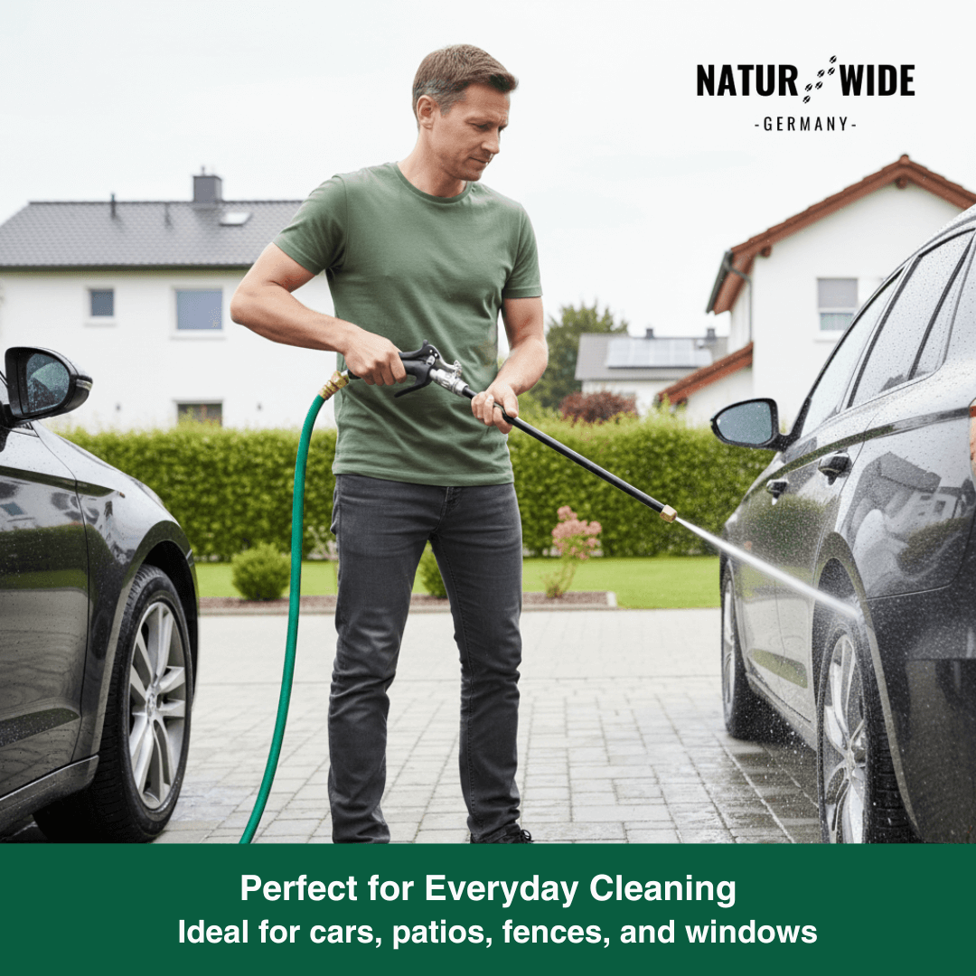 Do you want to remove stubborn dirt without having to set up an expensive and heavy electric pressure washer? Our High-Pressure Water Gun is the ideal solution for quick use around the house and garden. This attachment optimizes your garden hose's water pressure and creates a powerful jet for efficient cleaning.