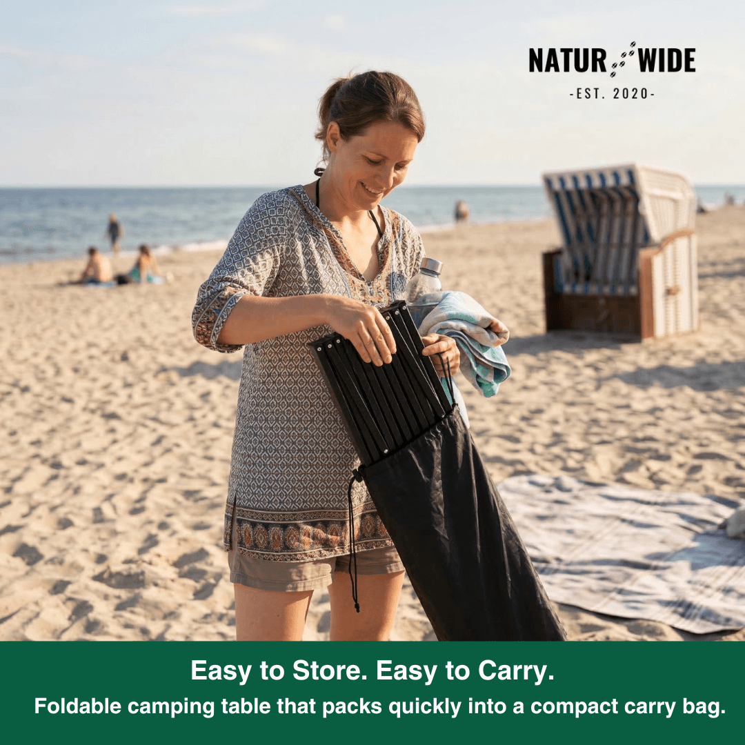 Weighing approximately 2.2 lbs, this folding table is as light as a bottle of water. It easily packs down for effortless transport to the beach, campsite, or park.